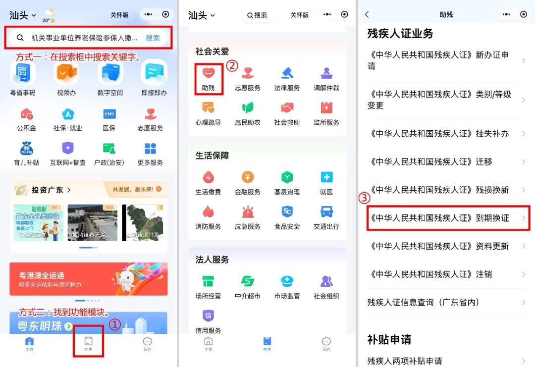 2. 打开粤省事小程序后,在搜索框搜索“残疾人证”等关键字;或在首页下方点击“办事”菜单,找到“社会关爱”栏目,点击“助残”进入“残疾人证业务”模块,选择“《中华人民共和国残疾人证》到期换证”。